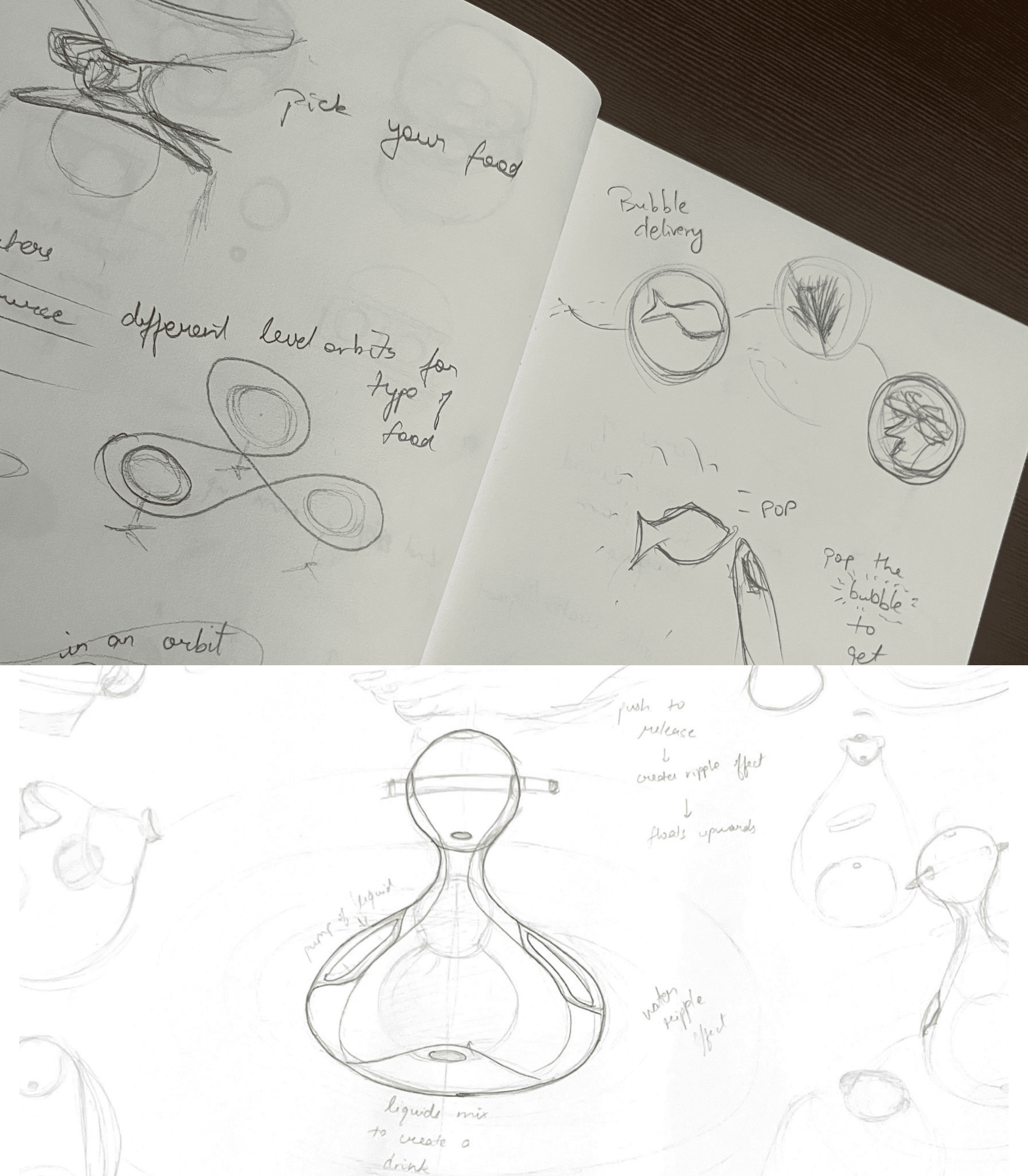 In the weightlessness of space, food isn’t just sustenance; it’s a moment to connect with familiar, grounding rituals. Each orb type draws inspiration from earthly gestures and interactions, making dining a mindful experience that bridges the distance between Earth and space. These orbs use organic, interactive opening mechanisms to encourage moments of discovery, playfulness, and ritual. They also address practical concerns of zero-gravity dining, providing controlled, elegant solutions to avoid food floating away.